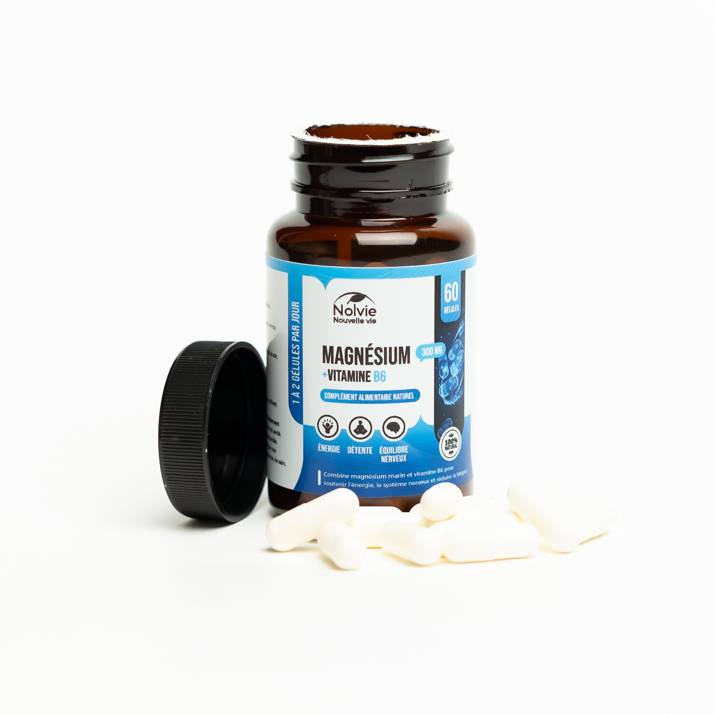 Apaise le système nerveux • Aide à réduire le stress et l’anxiété • Favorise un sommeil plus profond • Magnésium marin 300 mg + Vitamine B6 • Énergie et équilibre nerveux • 60 gélules •