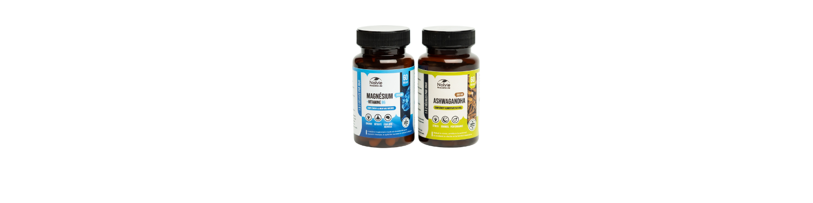 Pack anti-stress & relaxation • Apaise le système nerveux • Aide à réduire le stress et l’anxiété • Favorise un sommeil plus profond • Ashwagandha 300 mg + Magnésium marin 300 mg + Vitamine B6 • Énergie et équilibre nerveux •
