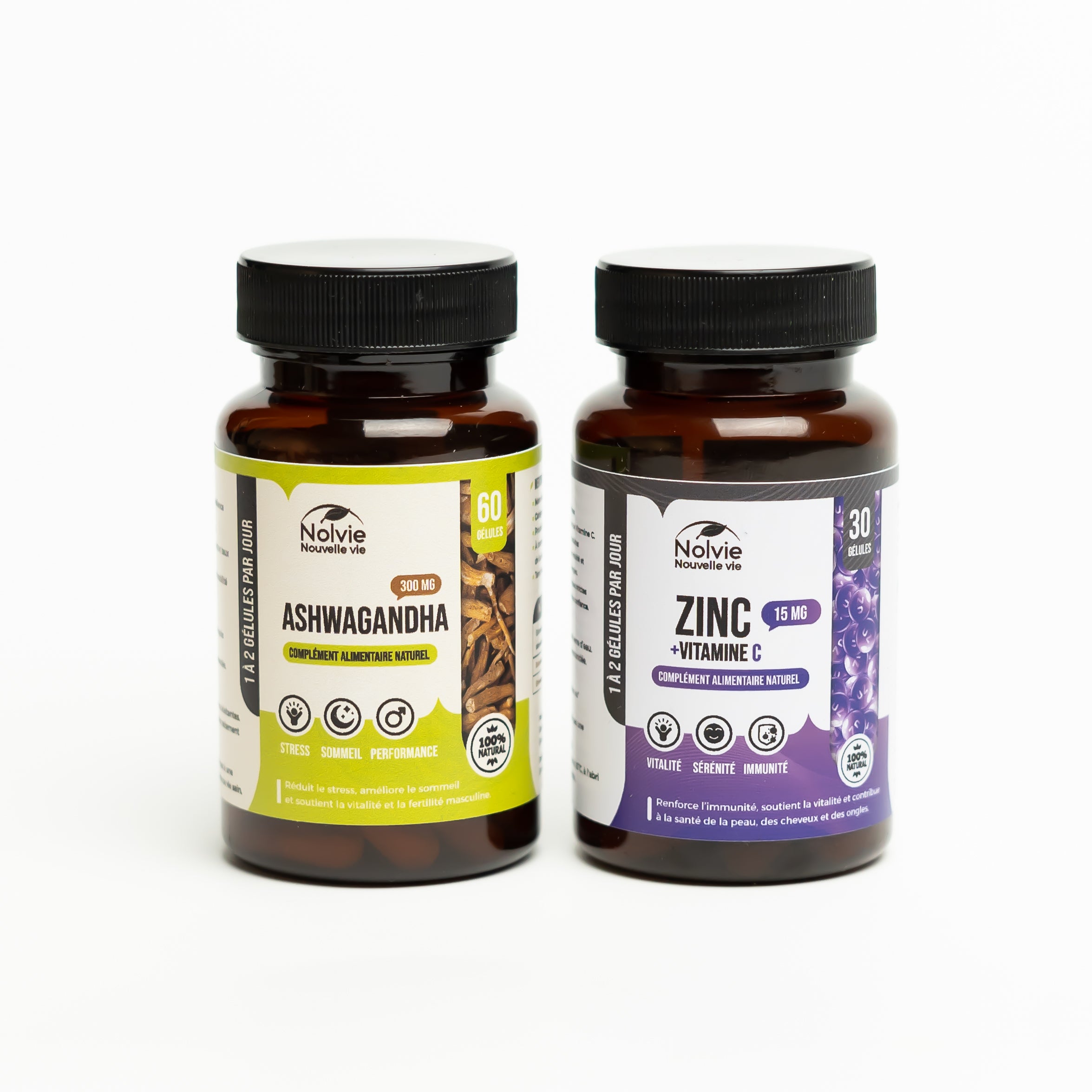 Le Pack Ashwagandha + Zinc est un ensemble de compléments alimentaires naturels conçu pour soutenir l’immunité, réduire le stress, améliorer le sommeil et favoriser la vitalité générale.