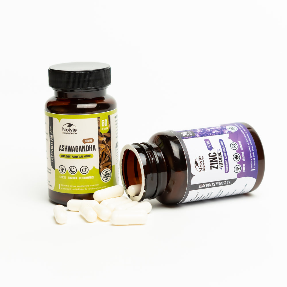 Pack immunité & anti-stress • Renforce les défenses naturelles • Aide à réduire le stress et la fatigue • Favorise un sommeil plus réparateur • Zinc bisglycinate + vitamine C + Ashwagandha 300 mg • Vitalité et équilibre nerveux • 30 gélules •