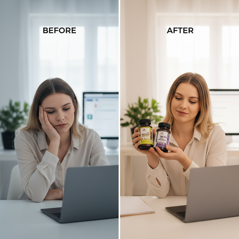Très bonne combinaison. Le zinc et la vitamine C soutiennent bien l’immunité, et l’ashwagandha aide à mieux gérer le stress. Effet progressif et naturel.